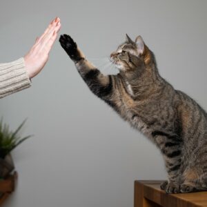 Clickertraining kann eingesetzt werden, um die Bindung zwischen Mensch und Katze zu stärken, um der Katze Tricks (wie z. B. das High Five auf dem Foto) beizubringen, aber auch, um unerwünschtes Verhalten zu korrigieren.